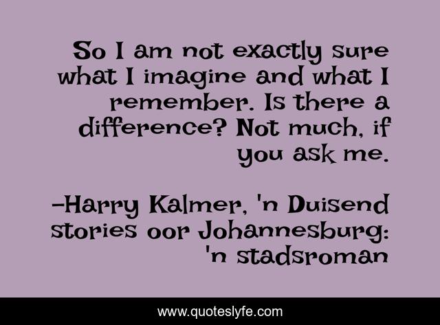 This page presents the quote "So I am not exactly sure what I imagine and what I remember. Is there a difference? Not much, if you ask me.". Author of this quote is Harry Kalmer, 'n Duisend stories oor Johannesburg: 'n stadsroman. This quote is about remember, imagine,.