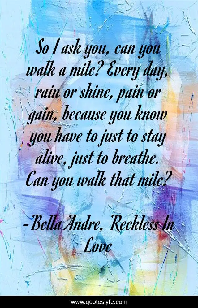 This page presents the quote "So I ask you, can you walk a mile? Every day, rain or shine, pain or gain, because you know you have to just to stay alive, just to breathe. Can you walk that mile?". Author of this quote is Bella Andre, Reckless In Love. This quote is about living, life, courage, moving-on,.