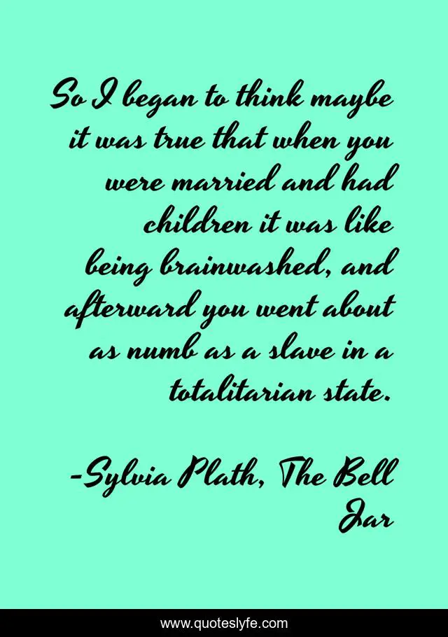 This page presents the quote "So I began to think maybe it was true that when you were married and had children it was like being brainwashed, and afterward you went about as numb as a slave in a totalitarian state.". Author of this quote is Sylvia Plath, The Bell Jar. This quote is about marriage, brainwashed, children,.