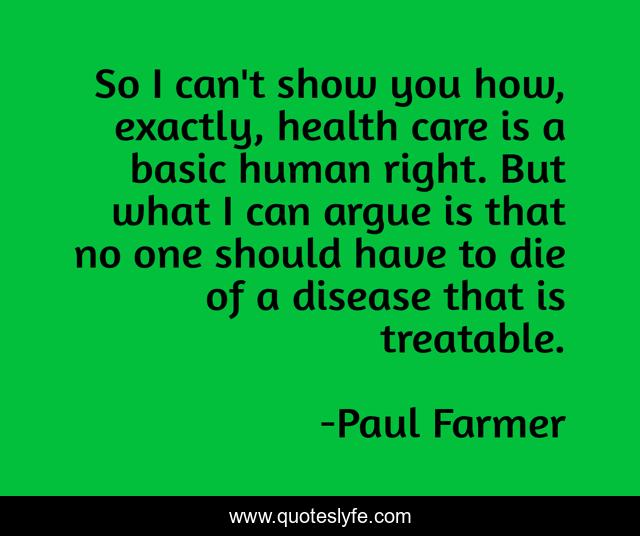 This page presents the quote "So I can't show you how, exactly, health care is a basic human right. But what I can argue is that no one should have to die of a disease that is treatable.". Author of this quote is Paul Farmer. This quote is about human, care,.