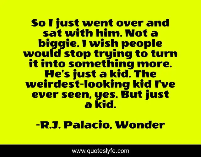 This page presents the quote "So I just went over and sat with him. Not a biggie. I wish people would stop trying to turn it into something more. He's just a kid. The weirdest-looking kid I've ever seen, yes. But just a kid.". Author of this quote is R.J. Palacio, Wonder. This quote is about friendship, humanism, acceptance-of-others,.