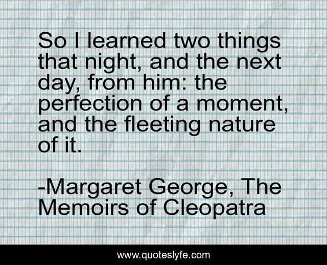This page presents the quote "So I learned two things that night, and the next day, from him: the perfection of a moment, and the fleeting nature of it.". Author of this quote is Margaret George, The Memoirs of Cleopatra. This quote is about relationships, loss, life, love, cleopatra, fiction, epiphany, journey, affection,.