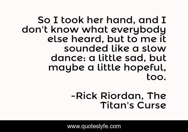 This page presents the quote "So I took her hand, and I don't know what everybody else heard, but to me it sounded like a slow dance: a little sad, but maybe a little hopeful, too.". Author of this quote is Rick Riordan, The Titan's Curse. This quote is about percy-jackson, annabeth-chase,.