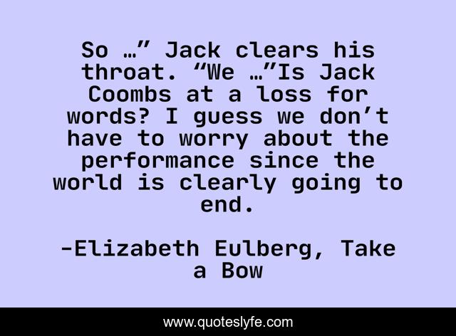 This page presents the quote "So …” Jack clears his throat. “We …”Is Jack Coombs at a loss for words? I guess we don’t have to worry about the performance since the world is clearly going to end.". Author of this quote is Elizabeth Eulberg, Take a Bow. This quote is about emme, performance, jack, words,.