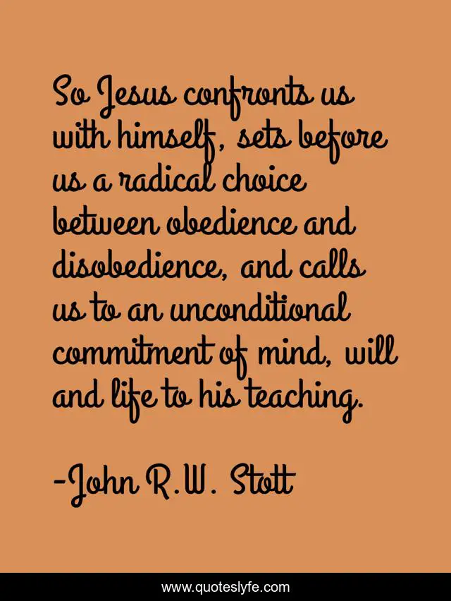 This page presents the quote "So Jesus confronts us with himself, sets before us a radical choice between obedience and disobedience, and calls us to an unconditional commitment of mind, will and life to his teaching.". Author of this quote is John R.W. Stott. .