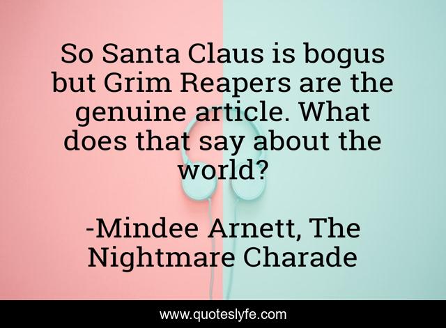 This page presents the quote "So Santa Claus is bogus but Grim Reapers are the genuine article. What does that say about the world?". Author of this quote is Mindee Arnett, The Nightmare Charade. This quote is about real, mgg, grim-reapers, not-real, the-nightmare-charade, mindee-arnett, santa-claus, world, the-arkwell-academy,.