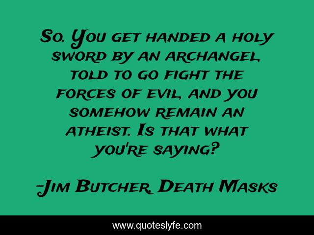 This page presents the quote "So. You get handed a holy sword by an archangel, told to go fight the forces of evil, and you somehow remain an atheist. Is that what you're saying?". Author of this quote is Jim Butcher, Death Masks. This quote is about atheism, humor, sanya, harry-dresden,.