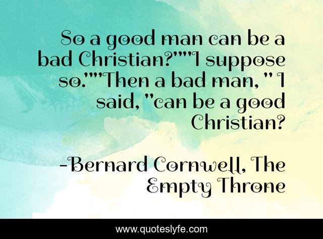 This page presents the quote "So a good man can be a bad Christian?""I suppose so.""Then a bad man, " I said, "can be a good Christian?". Author of this quote is Bernard Cornwell, The Empty Throne. This quote is about good-and-evil, religion-christianity, humour,.