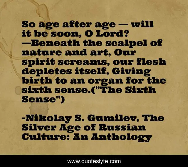 This page presents the quote "So age after age — will it be soon, O Lord? —Beneath the scalpel of nature and art, Our spirit screams, our flesh depletes itself, Giving birth to an organ for the sixth sense.("The Sixth Sense")". Author of this quote is Nikolay S. Gumilev, The Silver Age of Russian Culture: An Anthology. This quote is about art, spirit, sixth-sense, nature,.