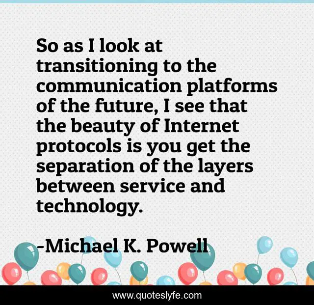 This page presents the quote "So as I look at transitioning to the communication platforms of the future, I see that the beauty of Internet protocols is you get the separation of the layers between service and technology.". Author of this quote is Michael K. Powell. This quote is about future, technology, beauty,.