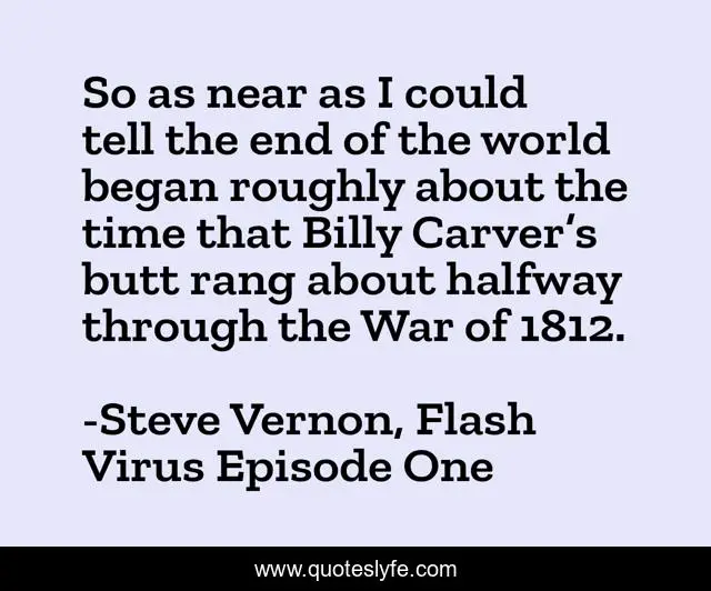 This page presents the quote "So as near as I could tell the end of the world began roughly about the time that Billy Carver’s butt rang about halfway through the War of 1812.". Author of this quote is Steve Vernon, Flash Virus Episode One. This quote is about dystopia, 1812, canadian-history, science-fiction, serial, young-adult,.