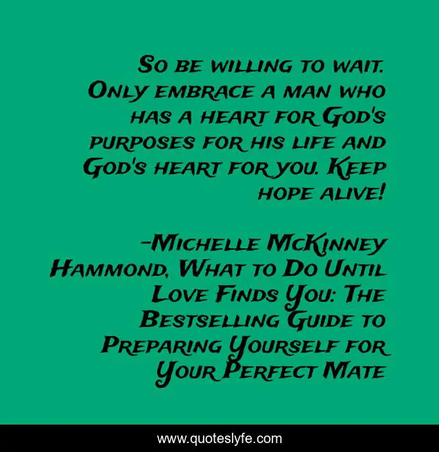 This page presents the quote "So be willing to wait. Only embrace a man who has a heart for God's purposes for his life and God's heart for you. Keep hope alive!". Author of this quote is Michelle McKinney Hammond, What to Do Until Love Finds You: The Bestselling Guide to Preparing Yourself for Your Perfect Mate. This quote is about enthusiasm, inspirational, relationship, christianity,.