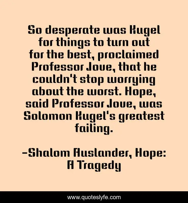 This page presents the quote "So desperate was Kugel for things to turn out for the best, proclaimed Professor Jove, that he couldn't stop worrying about the worst. Hope, said Professor Jove, was Solomon Kugel's greatest failing.". Author of this quote is Shalom Auslander, Hope: A Tragedy. This quote is about pessimism, optimism,.