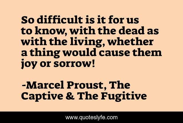 This page presents the quote "So difficult is it for us to know, with the dead as with the living, whether a thing would cause them joy or sorrow!". Author of this quote is Marcel Proust, The Captive & The Fugitive. This quote is about joy, sorrow, dead,.