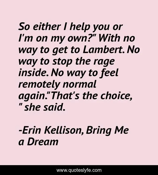 This page presents the quote "So either I help you or I'm on my own?" With no way to get to Lambert. No way to stop the rage inside. No way to feel remotely normal again."That's the choice, " she said.". Author of this quote is Erin Kellison, Bring Me a Dream. This quote is about urban-fantasy, paranormal,.