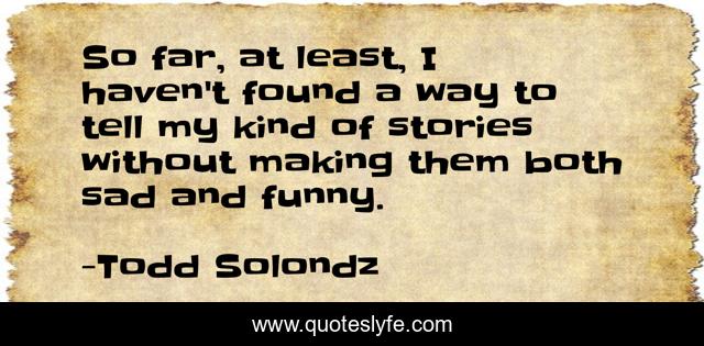 This page presents the quote "So far, at least, I haven't found a way to tell my kind of stories without making them both sad and funny.". Author of this quote is Todd Solondz. This quote is about funny, kind, comedy, way,.