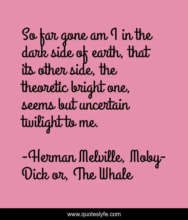This page presents the quote "So far gone am I in the dark side of earth, that its other side, the theoretic bright one, seems but uncertain twilight to me.". Author of this quote is Herman Melville, Moby-Dick or, The Whale. This quote is about pessimism, depression, mental-illness,.