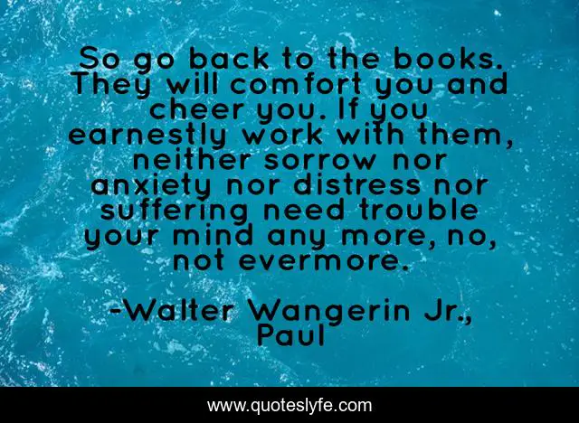 This page presents the quote "So go back to the books. They will comfort you and cheer you. If you earnestly work with them, neither sorrow nor anxiety nor distress nor suffering need trouble your mind any more, no, not evermore.". Author of this quote is Walter Wangerin Jr., Paul. This quote is about books, comfort,.