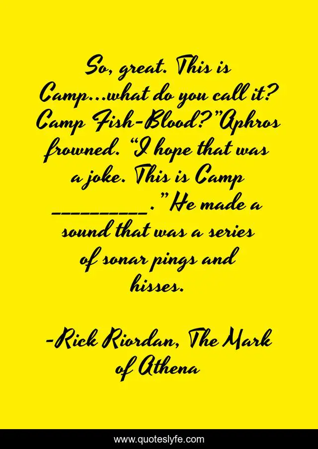 This page presents the quote "So, great. This is Camp…what do you call it? Camp Fish-Blood?”Aphros frowned. “I hope that was a joke. This is Camp __________.” He made a sound that was a series of sonar pings and hisses.". Author of this quote is Rick Riordan, The Mark of Athena. .
