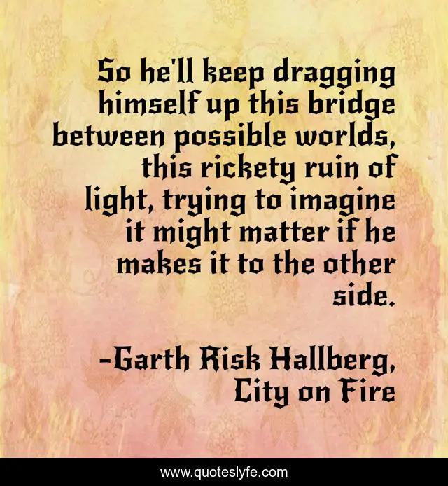 This page presents the quote "So he'll keep dragging himself up this bridge between possible worlds, this rickety ruin of light, trying to imagine it might matter if he makes it to the other side.". Author of this quote is Garth Risk Hallberg, City on Fire. This quote is about city-on-fire, journey, possible-worlds, garth-risk-hallberg,.