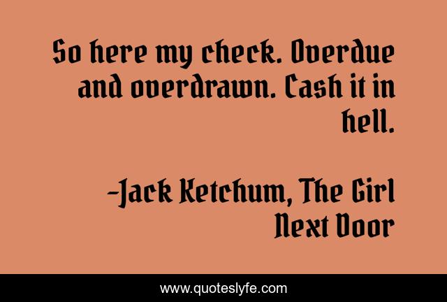 This page presents the quote "So here my check. Overdue and overdrawn. Cash it in hell.". Author of this quote is Jack Ketchum, The Girl Next Door. .