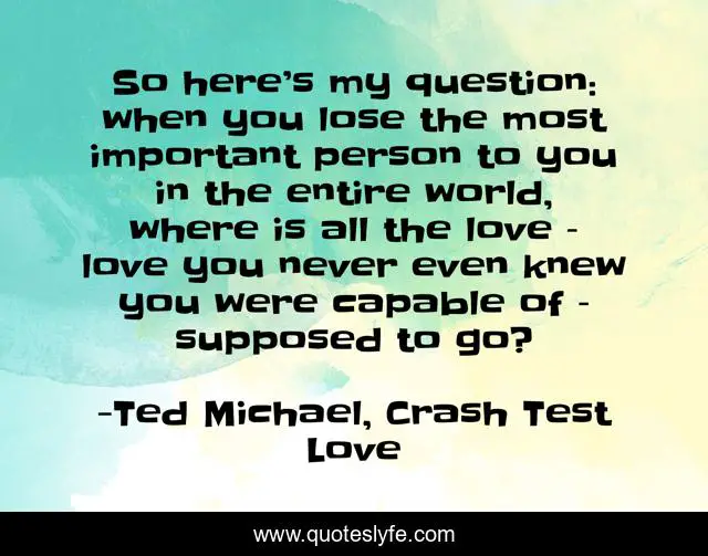 This page presents the quote "So here’s my question: when you lose the most important person to you in the entire world, where is all the love – love you never even knew you were capable of – supposed to go?". Author of this quote is Ted Michael, Crash Test Love. This quote is about heartbreak, love, affection,.