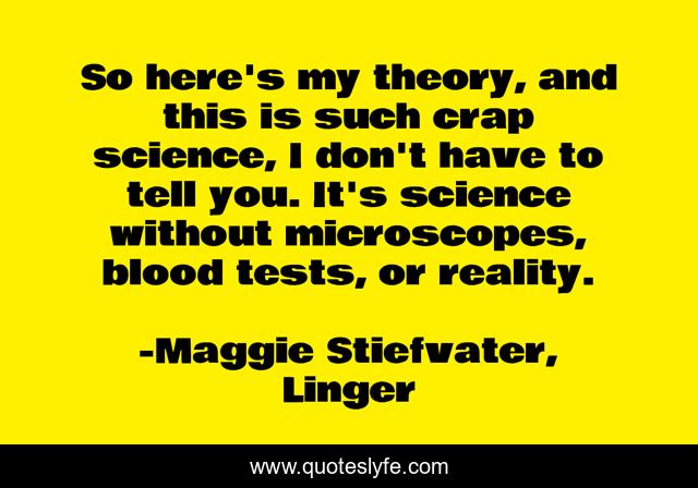 This page presents the quote "So here's my theory, and this is such crap science, I don't have to tell you. It's science without microscopes, blood tests, or reality.". Author of this quote is Maggie Stiefvater, Linger. .