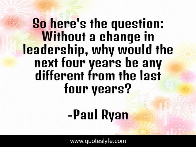 This page presents the quote "So here's the question: Without a change in leadership, why would the next four years be any different from the last four years?". Author of this quote is Paul Ryan. This quote is about question, why, change,.