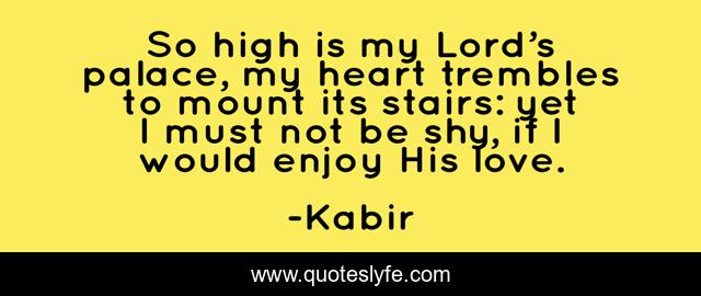 This page presents the quote "So high is my Lord’s palace, my heart trembles to mount its stairs: yet I must not be shy, if I would enjoy His love.". Author of this quote is Kabir. .