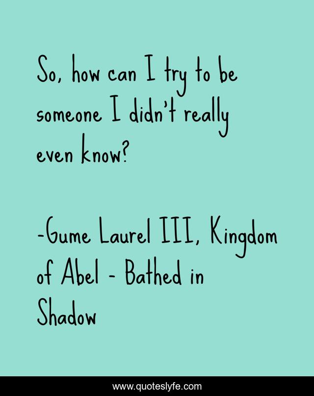 "Gume Laurel III, Kingdom of Abel - Bathed in Shadow Quotes." Quoteslyfe.com, 2025. Fri. 05 Dec. 2025. <https://www.quoteslyfe.com/quote/So-how-can-I-try-to-be-122950>.