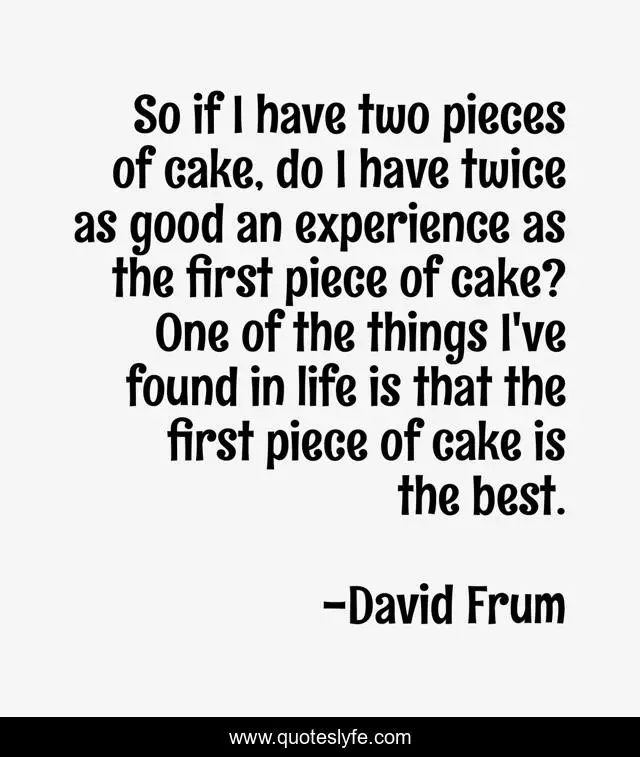 This page presents the quote "So if I have two pieces of cake, do I have twice as good an experience as the first piece of cake? One of the things I've found in life is that the first piece of cake is the best.". Author of this quote is David Frum. This quote is about life, good, best,.