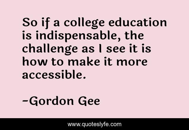 This page presents the quote "So if a college education is indispensable, the challenge as I see it is how to make it more accessible.". Author of this quote is Gordon Gee. This quote is about challenge, college,.