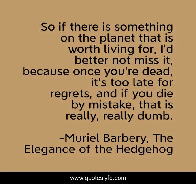 This page presents the quote "So if there is something on the planet that is worth living for, I'd better not miss it, because once you're dead, it's too late for regrets, and if you die by mistake, that is really, really dumb.". Author of this quote is Muriel Barbery, The Elegance of the Hedgehog. This quote is about life, death, humor, irony, the-elegance-of-the-hedgehog, muriel-barbery,.