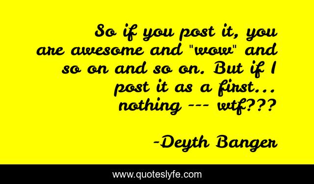 This page presents the quote "So if you post it, you are awesome and "wow" and so on and so on. But if I post it as a first... nothing --- wtf???". Author of this quote is Deyth Banger. This quote is about nothing, post, awesome, it, wtf,.