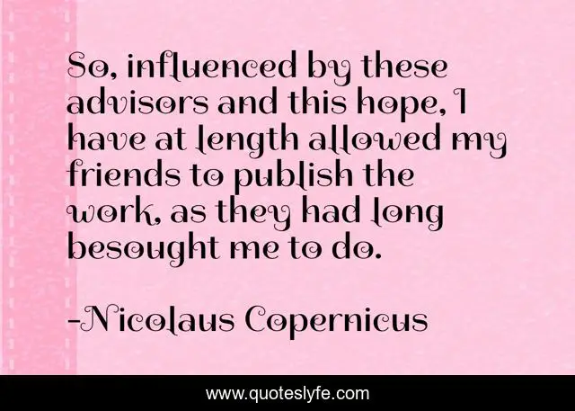 This page presents the quote "So, influenced by these advisors and this hope, I have at length allowed my friends to publish the work, as they had long besought me to do.". Author of this quote is Nicolaus Copernicus. This quote is about me, work, friends,.