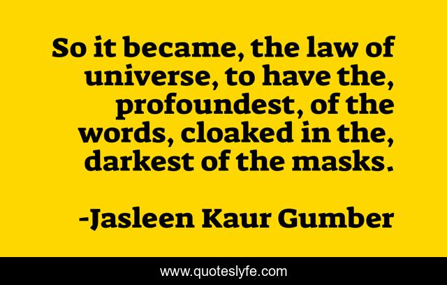 This page presents the quote "So it became, the law of universe, to have the, profoundest, of the words, cloaked in the, darkest of the masks.". Author of this quote is Jasleen Kaur Gumber. This quote is about mystery, life, darkest, profound, universe, philosophy, poetry, masks, wisdom,.