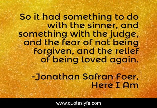 This page presents the quote "So it had something to do with the sinner, and something with the judge, and the fear of not being forgiven, and the relief of being loved again.". Author of this quote is Jonathan Safran Foer, Here I Am. This quote is about fear, love, sin, affection,.
