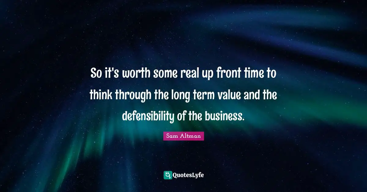 This page presents the quote "So it's worth some real up front time to think through the long term value and the defensibility of the business.". Author of this quote is Sam Altman. This quote is about long, business, time to think, real, long term, thinking,.