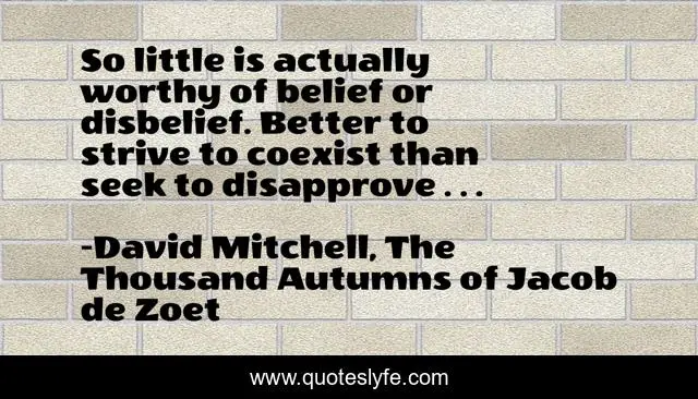 This page presents the quote "So little is actually worthy of belief or disbelief. Better to strive to coexist than seek to disapprove . . .". Author of this quote is David Mitchell, The Thousand Autumns of Jacob de Zoet. This quote is about belief, coexistence,.