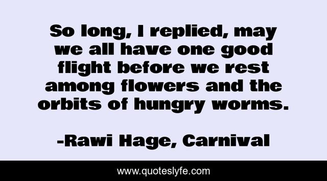 This page presents the quote "So long, I replied, may we all have one good flight before we rest among flowers and the orbits of hungry worms.". Author of this quote is Rawi Hage, Carnival. This quote is about good-flight, flowers, orbits, worms,.