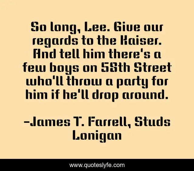 This page presents the quote "So long, Lee. Give our regards to the Kaiser. And tell him there's a few boys on 58th Street who'll throw a party for him if he'll drop around.". Author of this quote is James T. Farrell, Studs Lonigan. .
