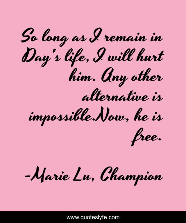 This page presents the quote "So long as I remain in Day's life, I will hurt him. Any other alternative is impossible.Now, he is free.". Author of this quote is Marie Lu, Champion. This quote is about goodbyes, freedom, daniel-altan-wing, june-iparis, hurt,.