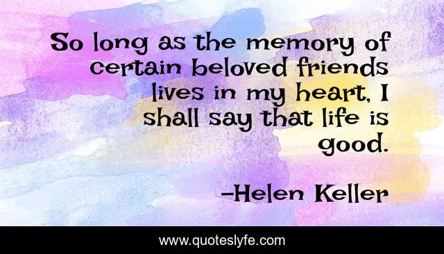 This page presents the quote "So long as the memory of certain beloved friends lives in my heart, I shall say that life is good.". Author of this quote is Helen Keller. This quote is about heart, life, friendship, goodness, memory,.
