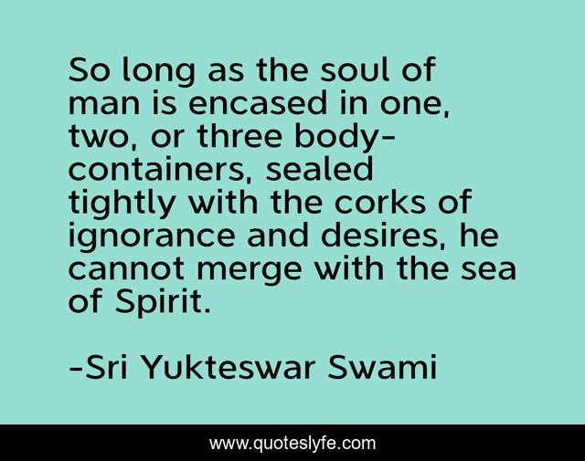 This page presents the quote "So long as the soul of man is encased in one, two, or three body-containers, sealed tightly with the corks of ignorance and desires, he cannot merge with the sea of Spirit.". Author of this quote is Sri Yukteswar Swami. This quote is about yoga, soul, wisdom,.