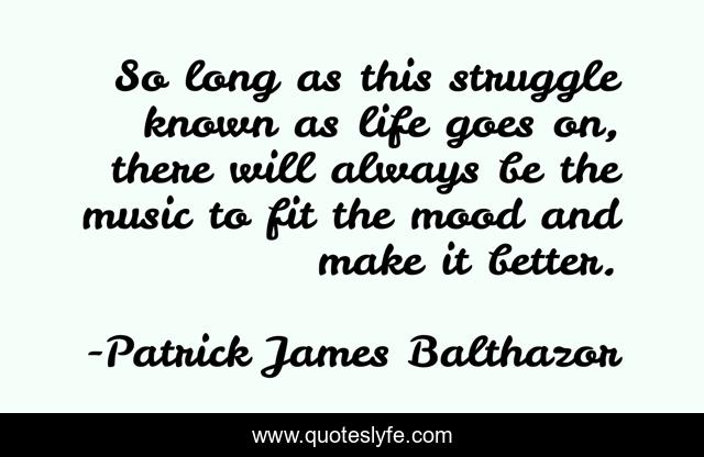 This page presents the quote "So long as this struggle known as life goes on, there will always be the music to fit the mood and make it better.". Author of this quote is Patrick James Balthazor. This quote is about emotion, life, music,.