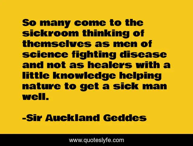 This page presents the quote "So many come to the sickroom thinking of themselves as men of science fighting disease and not as healers with a little knowledge helping nature to get a sick man well.". Author of this quote is Sir Auckland Geddes. This quote is about medicine, sickness,.
