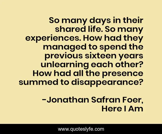 This page presents the quote "So many days in their shared life. So many experiences. How had they managed to spend the previous sixteen years unlearning each other? How had all the presence summed to disappearance?". Author of this quote is Jonathan Safran Foer, Here I Am. .