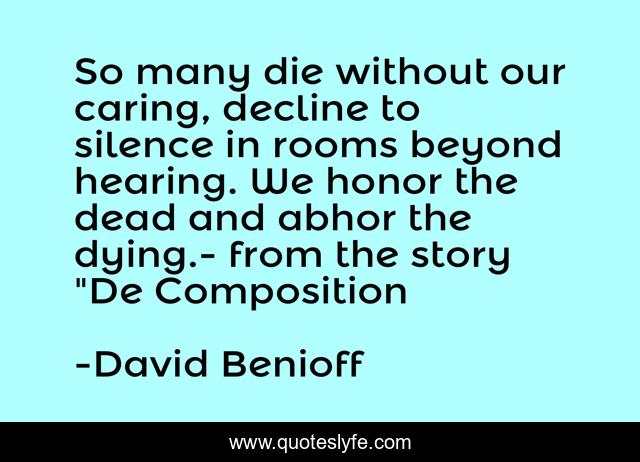 This page presents the quote "So many die without our caring, decline to silence in rooms beyond hearing. We honor the dead and abhor the dying.- from the story "De Composition". Author of this quote is David Benioff. .