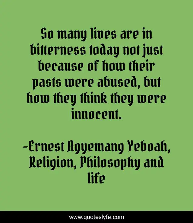 This page presents the quote "So many lives are in bitterness today not just because of how their pasts were abused, but how they think they were innocent.". Author of this quote is Ernest Agyemang Yeboah, Religion, Philosophy and life. This quote is about abuse-of-innocence, bitterness, innocence,.