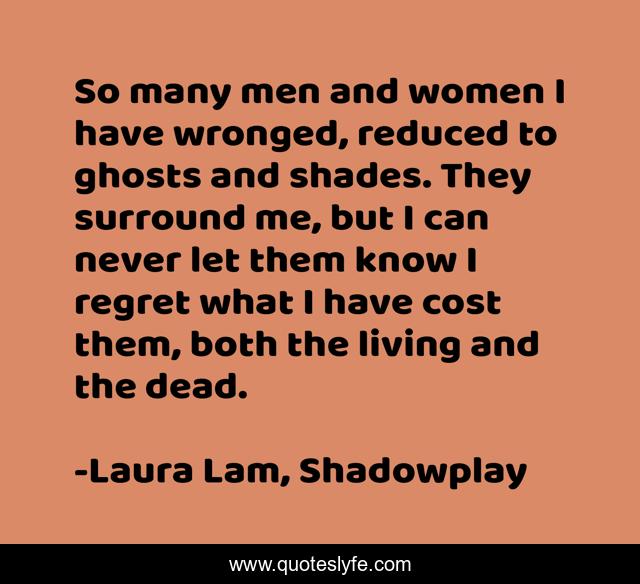 This page presents the quote "So many men and women I have wronged, reduced to ghosts and shades. They surround me, but I can never let them know I regret what I have cost them, both the living and the dead.". Author of this quote is Laura Lam, Shadowplay. This quote is about haunting, ghosts, seance, regret,.